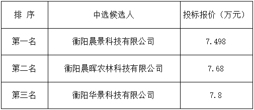 衡陽(yáng)市2023年度十六、十七批次建設(shè)用地項(xiàng)目采伐作業(yè)設(shè)計(jì)服務(wù)單位比選于2023年7月18日上午9時(shí)00分(北京時(shí)間)進(jìn)行了比選開(kāi)標(biāo)、評(píng)標(biāo)活動(dòng),評(píng)標(biāo)委員會(huì)按照比選文件規(guī)定的評(píng)標(biāo)辦法及原則進(jìn)行評(píng)定,推薦中選候選人排名如下: